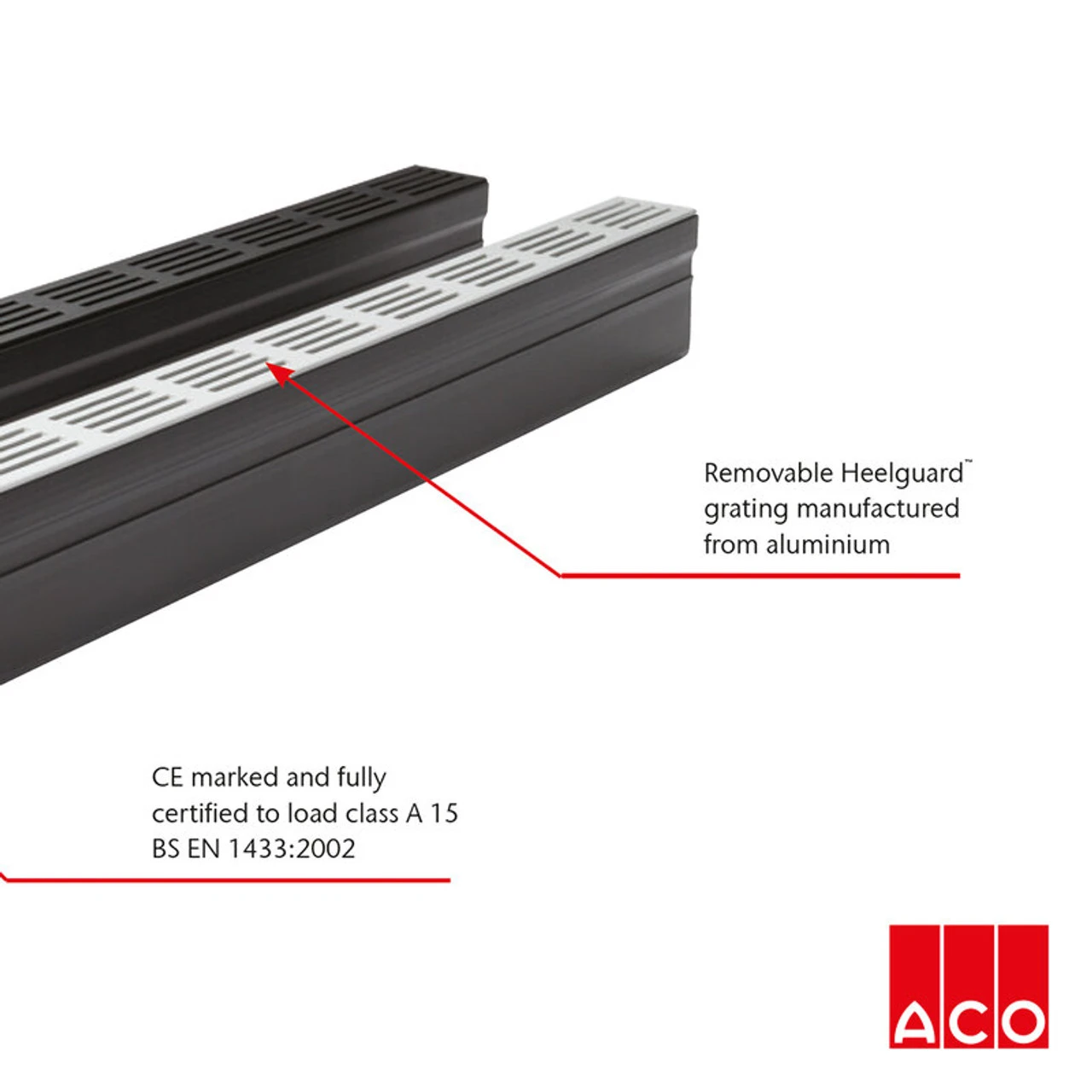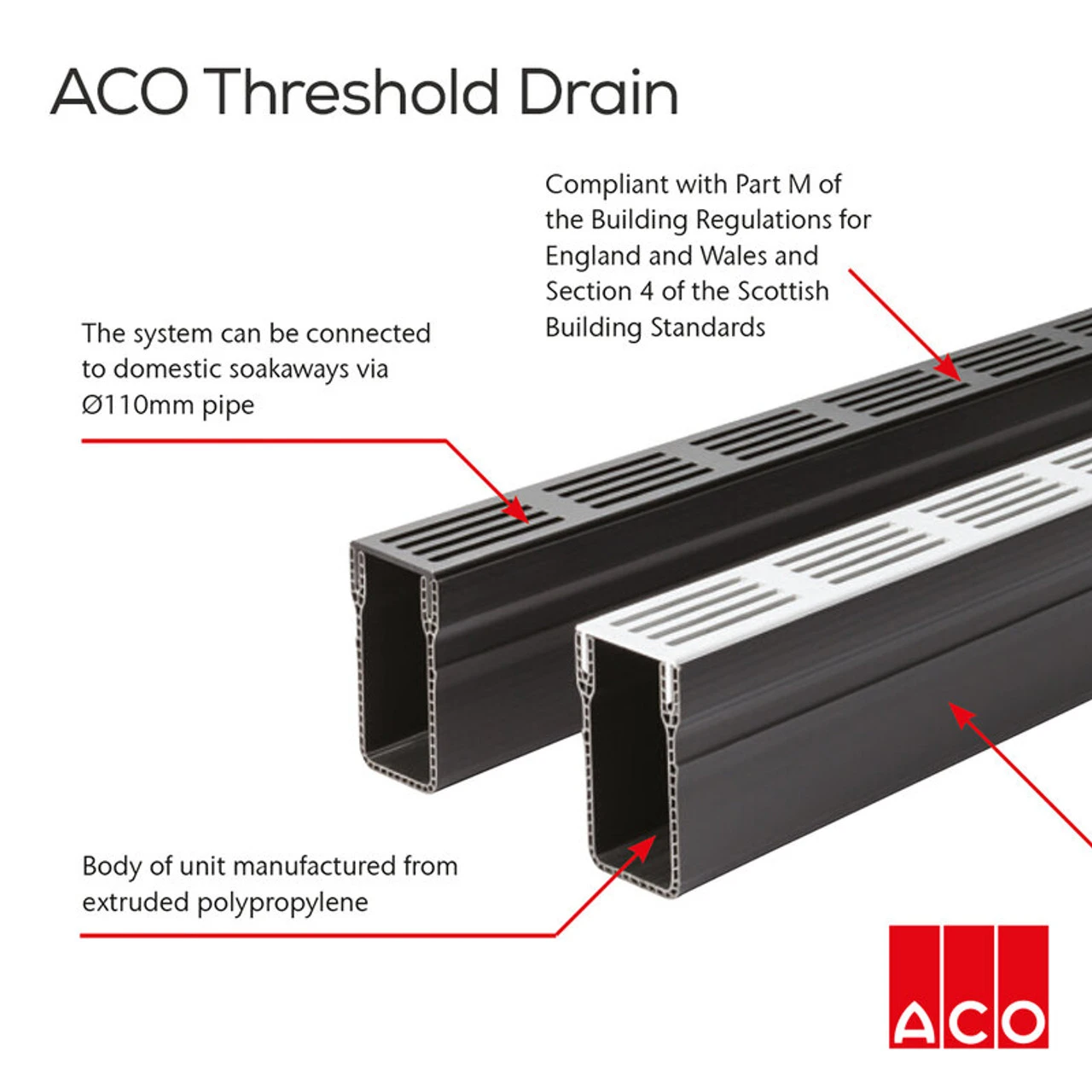 ACO Threshold Drain Drainage Channel Assembly with Silver Aluminium Grating 1000mm A 15. Manufactured from extruded PVC and aluminium, eliminates water ponding at house entrances. ACO Threshold Drain comes complete with a silver aluminium Heelguard grating suitable for pedestrian traffic. The discreet system has a width of 60mm and is available in 1m lengths. The system is compliant with Part M of the Building Regulations for England and Wales and Section 4 of the Scottish Building Standards.