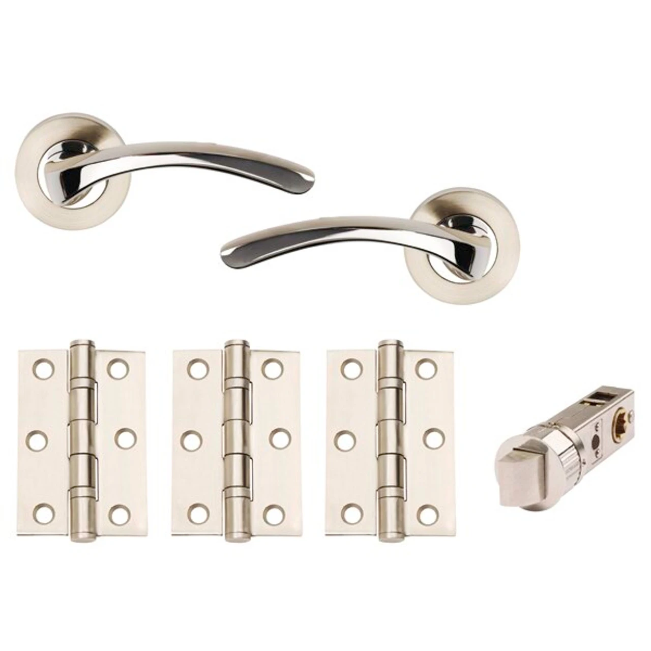 The Arc Box Pack includes a designer lever with a satin nickel plated and polished chrome plated finish and is on a round rose. The pack includes a 63mm mortice latch and 3 x 75mm ball bearing hinges. The multi-point fixing holes allow the mortice latch to be avoided during installation, whilst the split spindle ensures that the handle is fitted securely to the door.