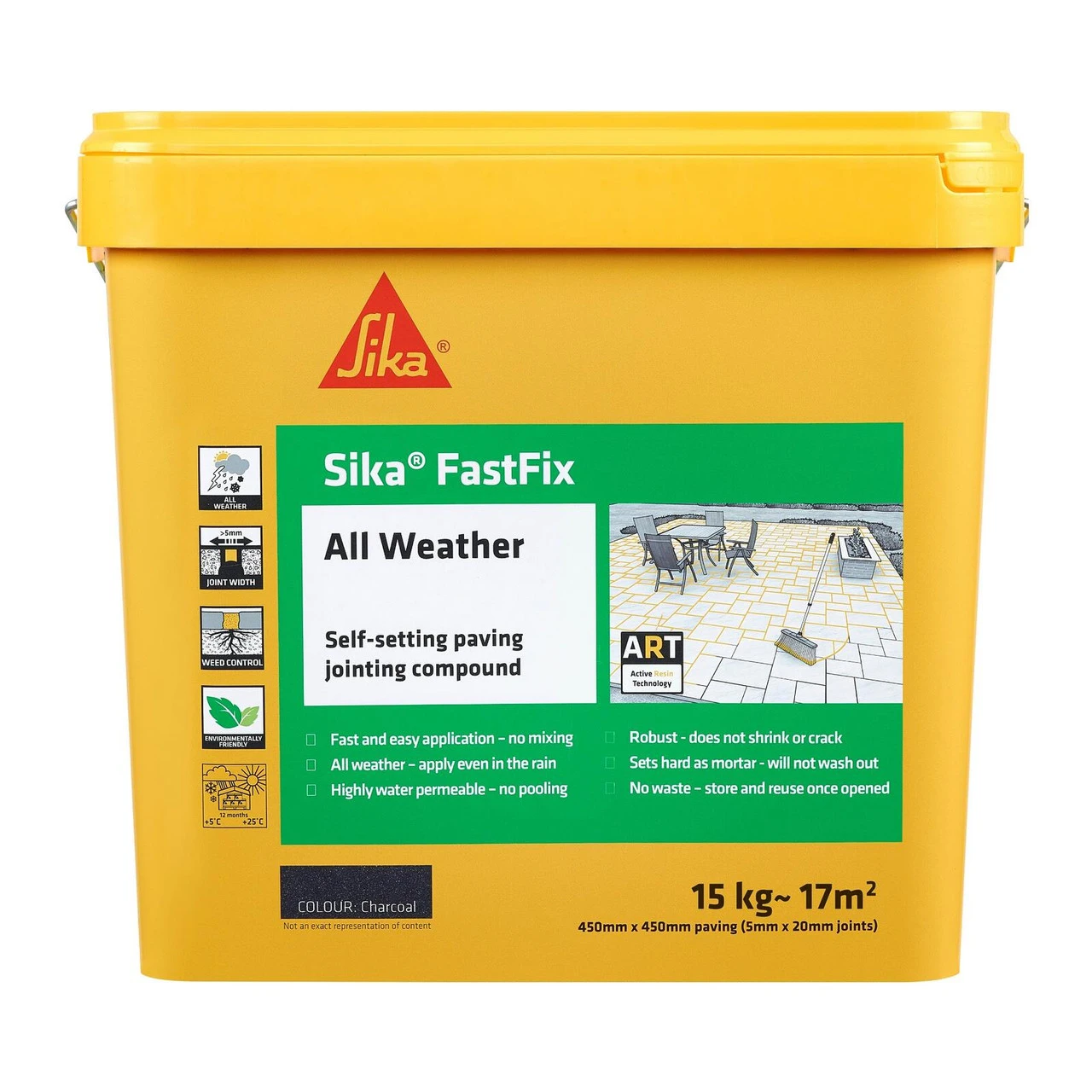 All-weather Sika FastFix (15kg) jointing compound is a simple solution for sealing joints between Indian paving stones, cobblestones, and walkways. The application process is sped up because no mixing is required. Even when applied in the rain, this joint compound provides a flawless finish in all weather circumstances. The FastFix is permeable to water and will prevent pooling. It’s a strong product that won’t shrink or crack. This jointing solution hardens to the consistency of mortar and acts as a weed barrier. FastFix helps you save money by allowing you to preserve any unused jointing compound in the bucket for up to a month, immersed in water. Dark buff, deep grey, flint, and stone are other options.