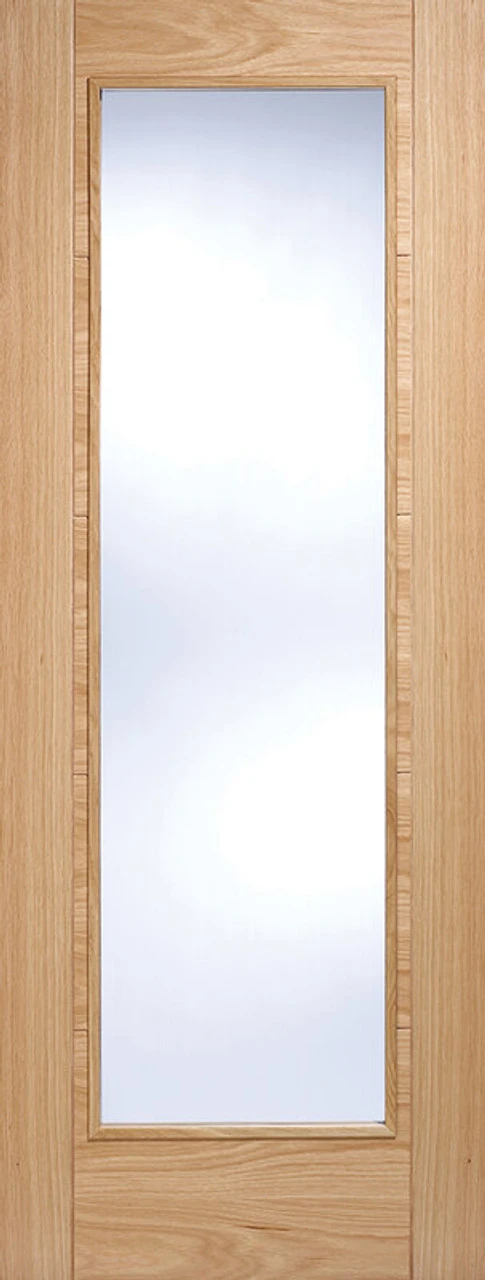 This Vancouver door features a pre-finished Oak wood grain, raised moulding on both sides and a large clear glazed centre panel.