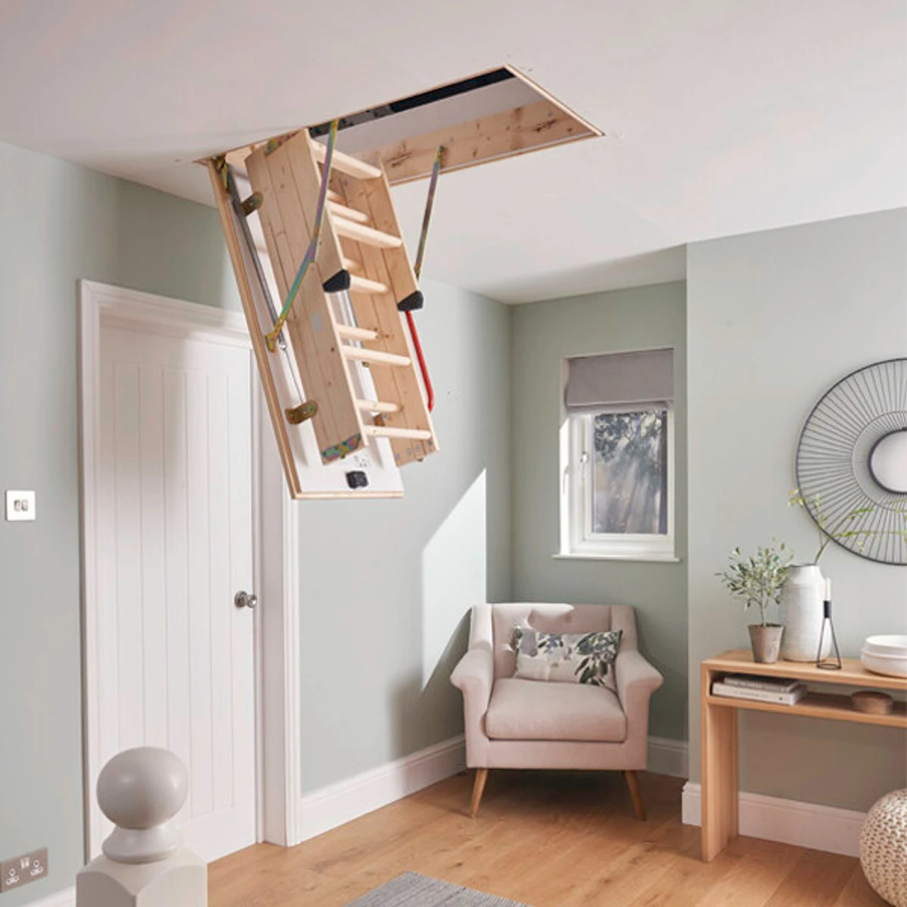 The 34535000 Eco S Line is a 3 section folding timber loft ladder with an insulated draught-proof hatch. Features include a handrail and slip-resistant treads. This loft ladder is stored within the trapdoor so no loft floor space is used. Suitable for heights up to 2.81m.