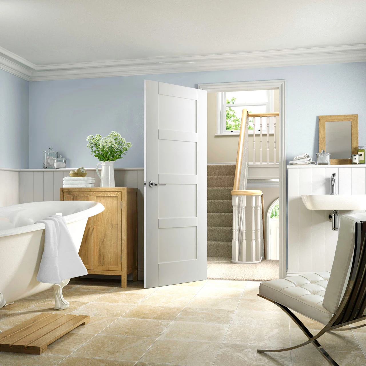 A versatile white primed 4 panel shaker fire door. A simple yet sleek design the Shaker half hour fire rated door is a door that can complement any setting. Matching panelled, glazed and bi-fold doors are available to complement this range.